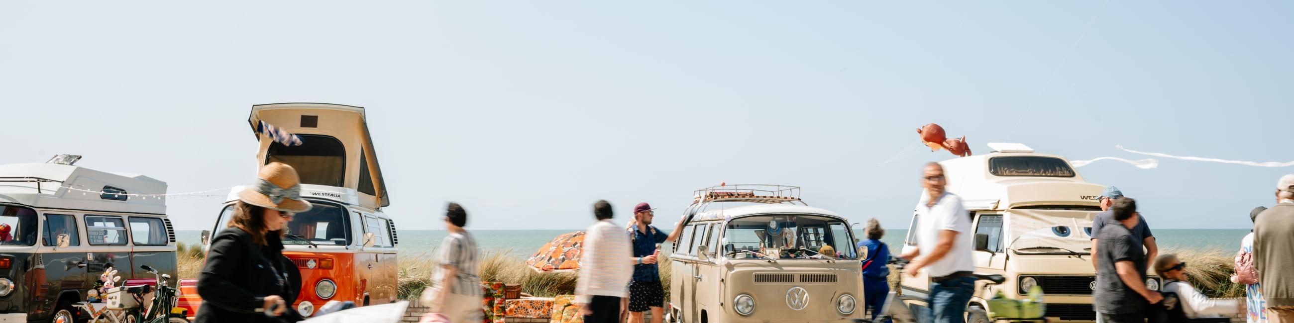 Zo’n 200 vintage volkswagenbussen kamperen op de zeedijk.
