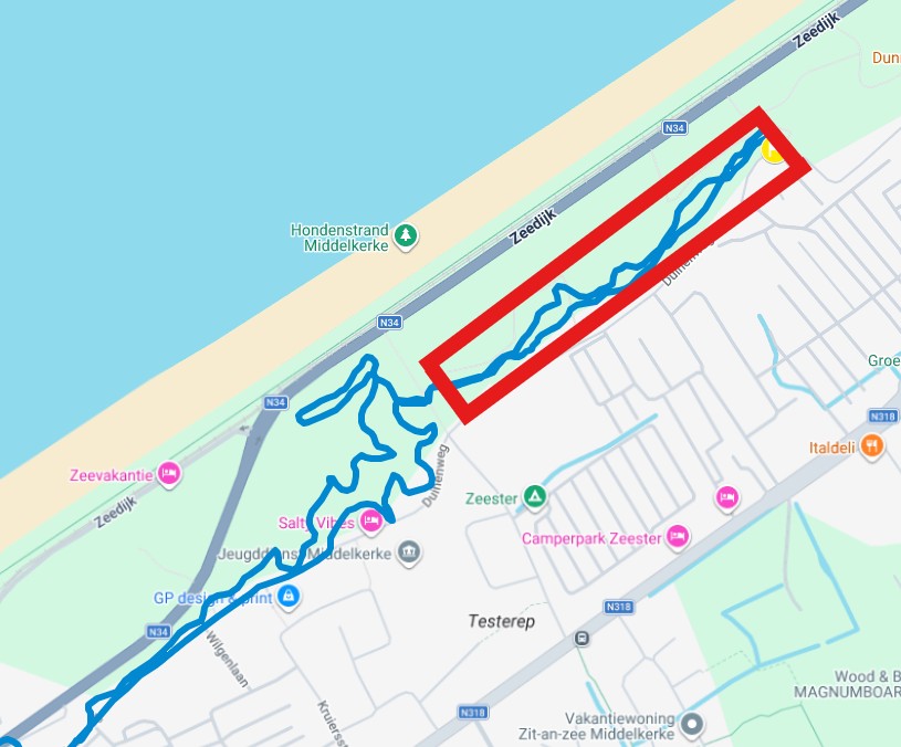 Door de werken i.k.v. Life Dunias is het stuk van de mountainbikeroute ten oosten van Middelkerke door de Schapenweide (zie foto) onderbroken. Het kan zijn dat een stuk van de route ook na de werken nog niet helemaal hersteld zal zijn.